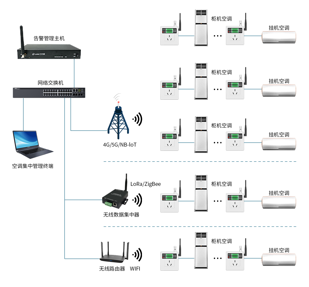 ACsmart系列無線空調控制器,可選配不同類型的通訊模塊,支持包括:WiFi、LoRa、ZigBee、NB-IoT、4G/5G等無線通信方式,空調控制器聯網成功后,空調集中管理中心即可實時監測所有空調的開啟狀態、運行參數以及用電詳情等信息,同時支持遠程控制所有在網空調,支持"一鍵"操作批量空調,譬如:一鍵開/關機、設定統一運行溫度、系統自動調度聯動指定空調等功能。