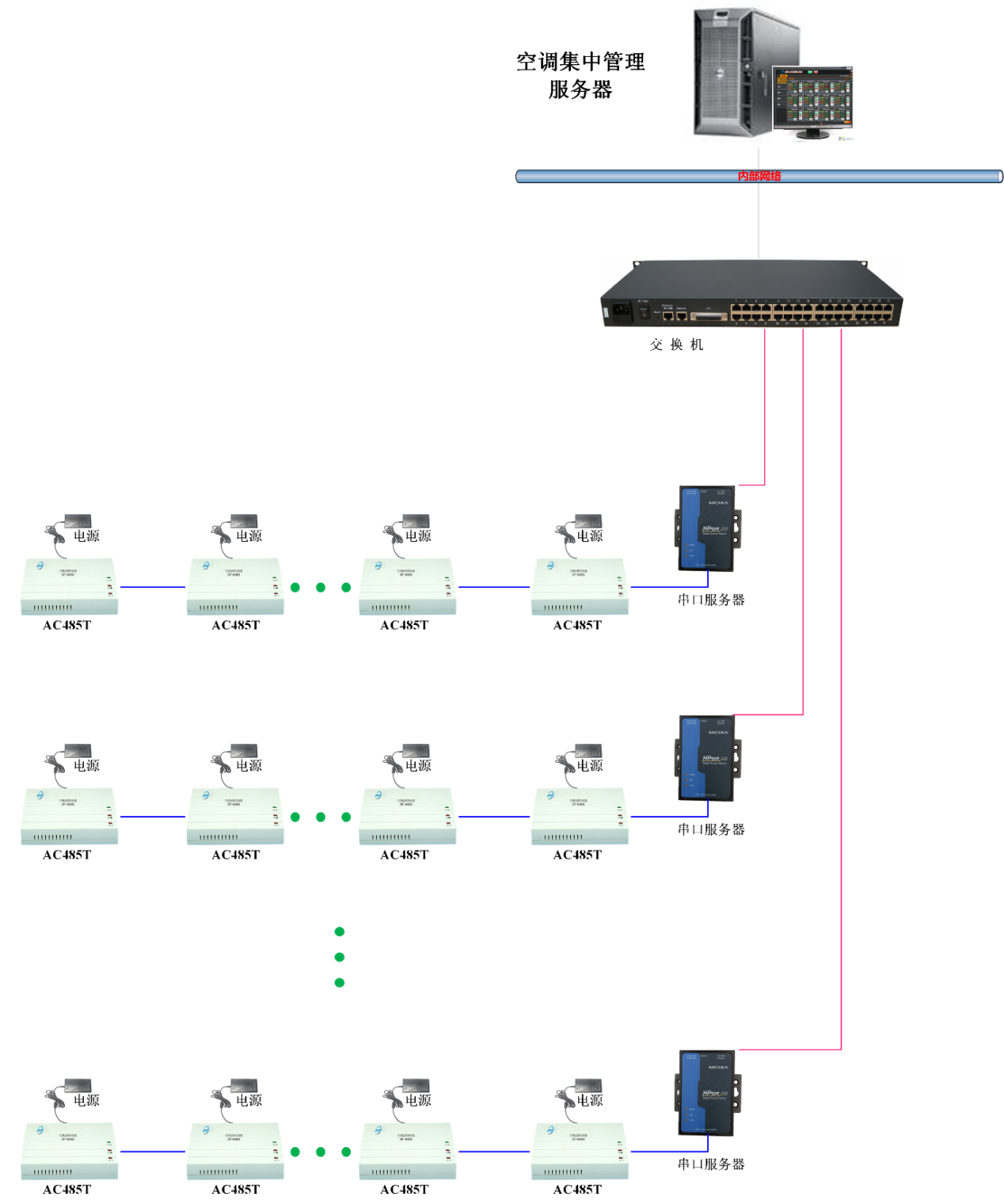 所幸的是該公司通過網(wǎng)上搜索:空調(diào)控制器廠家找到我們,在接到需求的第一時間,我司擁有10年空調(diào)系統(tǒng)設(shè)計經(jīng)驗的鄭工馬上結(jié)合公寓的實際情況,設(shè)計通過:在每個公寓房間安裝1臺485型空調(diào)控制器,然后將所有AC485T空調(diào)控制器聯(lián)網(wǎng),構(gòu)成“空調(diào)集中管理網(wǎng)絡(luò)”,系統(tǒng)架構(gòu)圖如下: